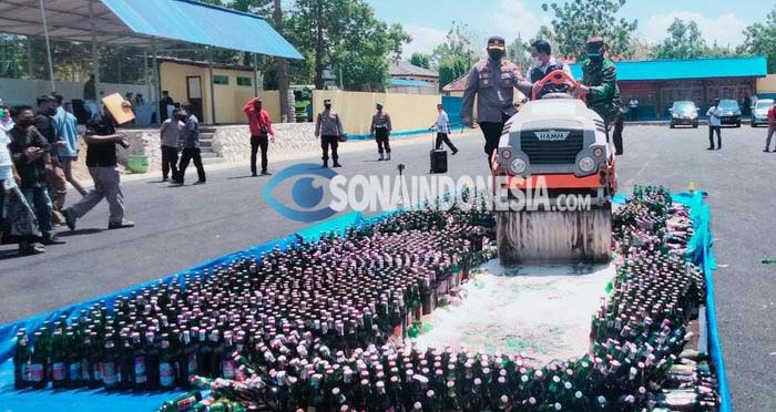 Bupati Pamekasan Baddrut Tamam bersama Kapolres Pamekasan AKBP Apip Ginanjar dan Dandim 0826/Pamekasan Letkol Inf. Joko Baskoro, secara simbolis melakukan pemusnahan dengan melindas ribuan botol miras menggunakan alat berat.