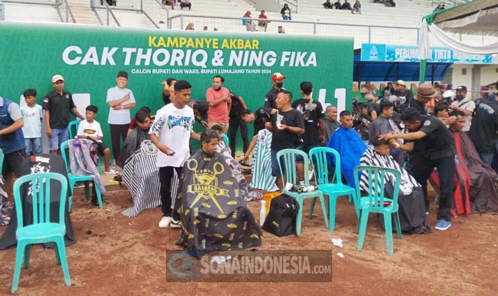 Lumajang, SonaIndonesia.com – Komunitas tukang cukur atau barber shop Pogester Lumajang membuka stand potong rambut gratis di acara Kampanye Akbar Pasangan Calon Bupati dan Wakil Bupati Lumajang nomor urut satu (1), Thoriqul Haq – Lucita Izza Rafika (Cak Thoriq-Ning Fika) di Stadion Semeru Lumajang, Sabtu (16/11).