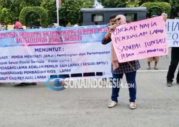 Ponorogo, SonaIndonesia.com – Puluhan pedagang Pasar Legi Ponorogo melakukan unjuk rasa di depan Pasar Legi dan Kantor Bupati Ponorogo, Rabu (7/4). Para pedagang itu menuntut transparansi pembagian lapak.