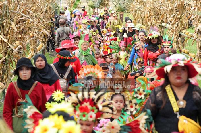 Ada yang mengenakan kostum dari daun kelapa, dengan bermahkotakan daun pisang. Ada juga yang mengenakan sayap dari jagung, kalung dari buah tomat, dan bermahkota buah semangka.