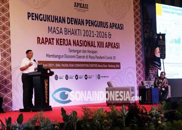 Bali, ArahJatim.com – Dalam sesi Rakernas XIII Apkasi Tahun 2021 yang digelar bersamaan dengan acara pengukuhan Dewan Pengurus Apkasi masa bakti 2021-2026, hadir secara langsung Menteri Koordinator Bidang Kemaritiman dan Investasi Luhut Binsar Pandjaitan dan Menteri Pertanian Syahrul Yasin Limpo. Sementara dua menteri lainnya hadir secara daring sebagai narasumber, yaitu Menteri Keuangan Sri Mulyani dan Menparekraf Sandiaga S Uno.